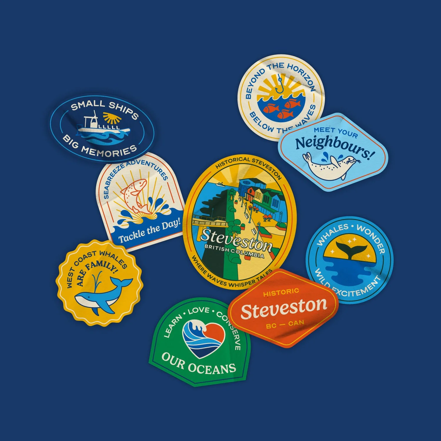 A series of illustrated badges, inspired by retro travel stickers and outdoor adventure patches, add a playful touch while highlighting key brand values. The photography style uses a rustic, duotone effect, evoking the wild roughness of nature and vintage printing techniques. The color palette, inspired by the vibrant hues of the Westcoast and Steveston area, balances professionalism with fun and adventure, reinforcing the brand's unique character.